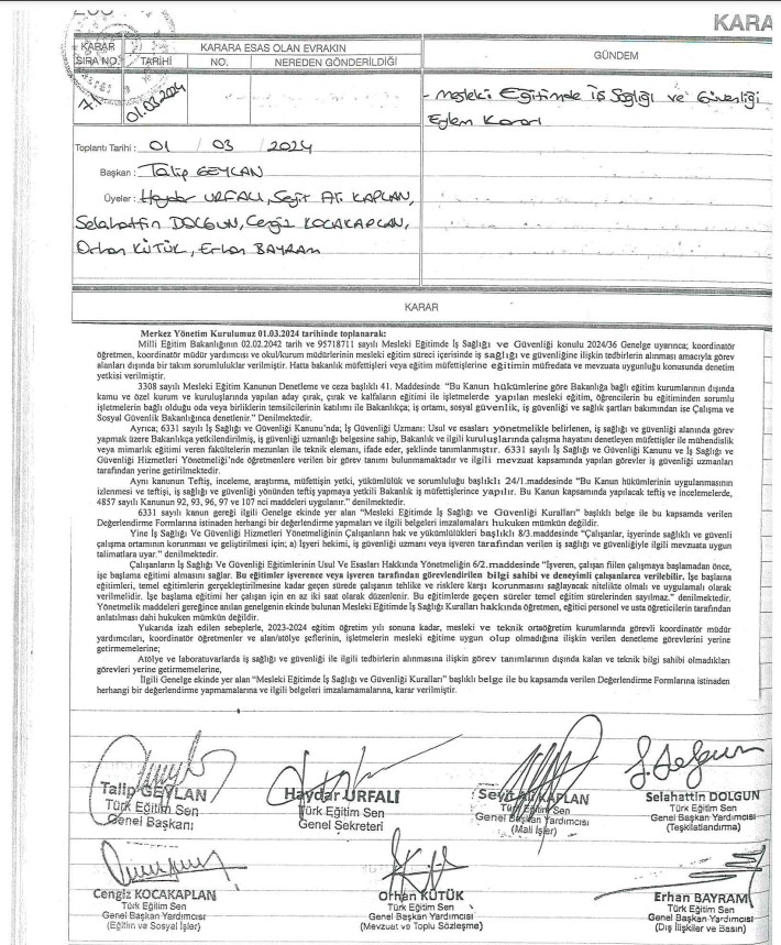 Türk Eğitim-Sen tarafından alınan 01.03.2024 tarih ve 71 sayılı Merkez Yönetim Kurulu kararı ile; 2023-2024 eğitim öğretim yılı sonuna kadar, mesleki ve teknik ortaöğretim kurumlarında görevli koordinatör müdür yardımcıları, koordinatör öğretmenler ve alan/atölye şeflerinin, işletmelerin mesleki eğitime uygun olup olmadığına ilişkin verilen denetleme görevlerini yerine getirmemelerine;