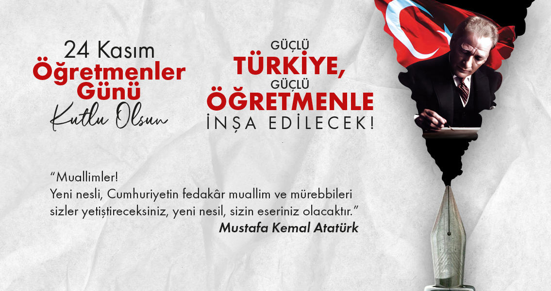 Tüm öğretmenlerimizin 24 Kasım Öğretmenler Günü’nü kutluyor; Başöğretmenimiz Atatürk’ün izinde gelecek nesilleri yetiştirmenin gururunu taşıyoruz.