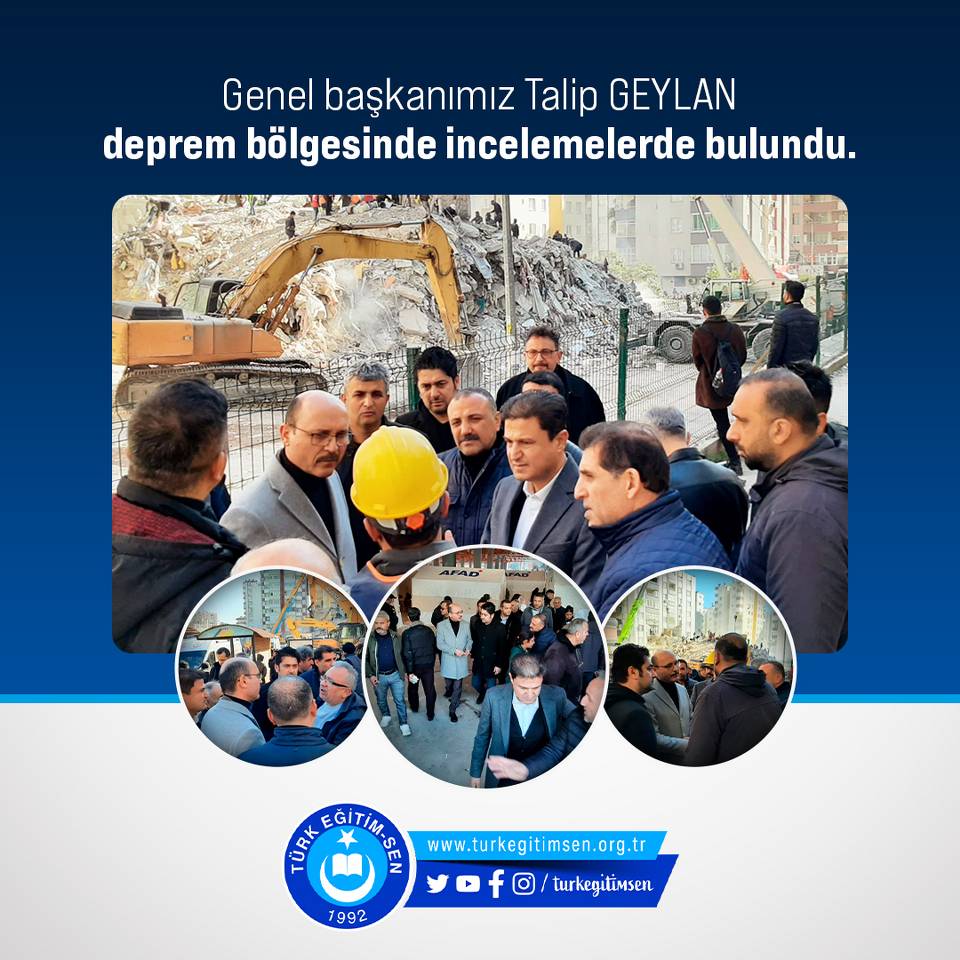 Türk Eğitim-Sen Genel Başkanı Talip Geylan, Genel Başkan Yardımcısı Selahattin Dolgun ile birlikte 08.02.2023 tarihinde depremin vurduğu Adana’da, teşkilatlarımızla depremden etkilenen ve hasar gören yerleri ziyaret etti. Geylan, Afet Yönetim Merkezi’nde sorumlu Vali Yardımcısı ve İl Milli Eğitim Müdür Yardımcısından çalışmalar ve gelişmeler hakkında bilgi aldı.